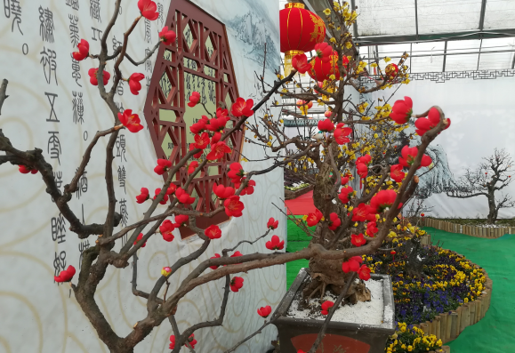 今天上午,大河客戶端記者在梅花展廳看到,不同品種的梅花被做成了盆景造型,配以雪花、茅屋、窗臺點綴,形成一道道獨特的景觀。怒放的花朵、含羞的花苞,數千平米的展廳內香氣四溢,惹得游人如癡如醉。