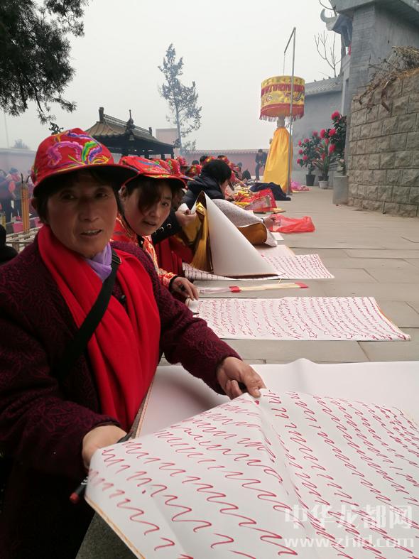 大霧的確延緩了香客的腳步,這也讓晚來的記者得以看到祭拜的盛景。女媧陵前,十幾名身著統一緞面紅襖,穿黑棉布鞋的女客正在結伴焚香祭拜,口音明顯和當地人不同。她們是從距西華300多公里的濮陽范縣、臺前縣來的,說是凌晨2時就起身出發,大霧中不僅遭遇堵車,還迷了路,到女媧城都快8時了。她們這次一起來的有30多人,分乘4輛車。就像往常前來一樣,她們在女媧城要焚香、跪拜、“寫賬”(在紙上畫符,敬奉女媧的一種民間形式)、“守功”(在大殿靜坐,以示對女媧親近),直至下午方回。“我們每年六月初一和臘月初一都來,為啥?信奉女媧娘娘唄,不來不舒服。”其中一位孔姓香客告訴記者。