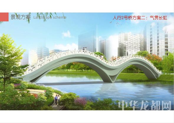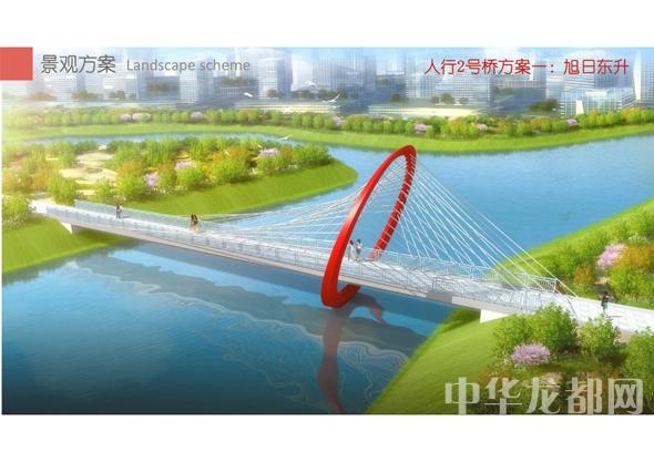 人行2號橋的設(shè)計方案有兩套,分別為“旭日東升”和“氣貫長虹”。“旭日東升”為圓形塔懸索橋。記者從效果圖中看到,該橋的橋塔為圓形,猶如一輪東升的太陽,象征著城鄉(xiāng)一體化示范區(qū)蓬勃發(fā)展的未來。“氣貫長虹”為中承式系桿拱橋。該方案結(jié)合中國玉帶橋的古典元素、抽象古典幾何美學(xué),采用現(xiàn)代的設(shè)計手法,創(chuàng)作出現(xiàn)代感和中國傳統(tǒng)橋梁元素雜糅的橋梁設(shè)計。