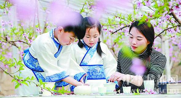 日前,一位年輕的媽媽帶著一雙兒女在扶溝縣韭園鎮的一個溫室大棚基地學習茶藝。據悉,該基地共有11個桃樹溫室大棚和200畝露地桃林。在近1個月的花期里,該基地免費向游客開放。前來賞花的游客不但可以在花間彈古箏、拍照,也可以學習茶藝,既欣賞了美景,又陶冶了情操。谷志方 李永超 攝