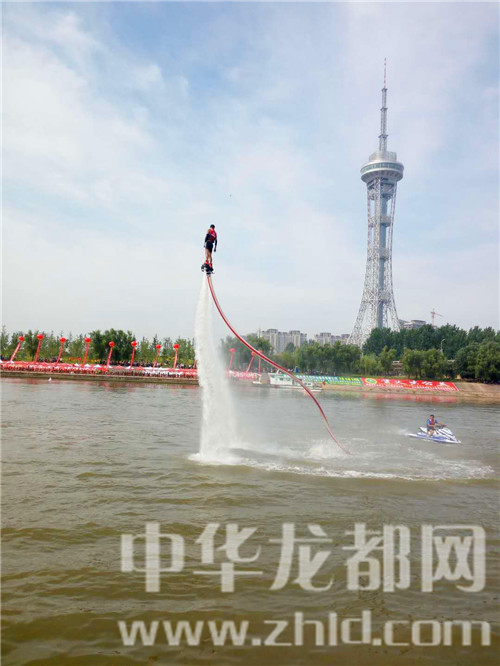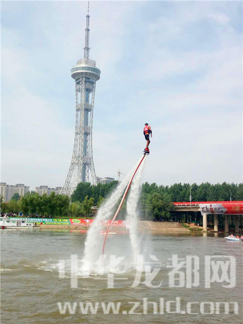 開幕式上,大賽組委會請來的“水上飛人“表演令觀眾驚嘆不已,只見一名運動員腳下踩著特制的噴水裝置,猶如鋼鐵俠一般,從水中騰空而起,時而在半空中靜止不動,時而從空中飛魚入水,連續做出前后空翻、空中回旋、蛟龍出水等各種華麗特技,令觀眾尖叫雀躍。期間,水上兩艘快速疾飛的船模表演,以及空中翻飛自若的航模表演,都給觀眾帶來了不一樣的視覺感受。
