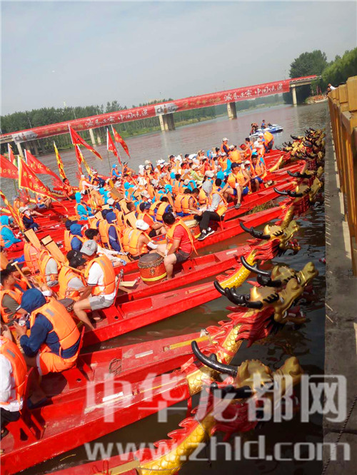 比賽開始前,位于周口大道橋東側的中華龍舟大賽賽場已是喧聲鑼鼓,人海如潮,不少市民攜家帶口前來觀戰。河中,二十多條龍舟整齊地排列在水面上。