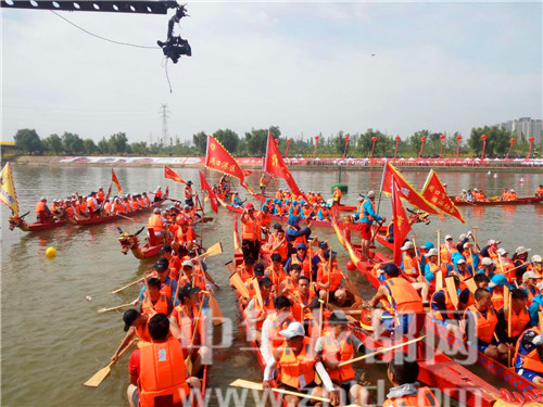 精彩無比的翎船捕鴨賽后,首先進行的是市直組、企業組200米競速賽的預選賽。隨著發令槍響,各參賽隊伍迅速搖動船槳,爭先恐后地向前劃行。在兩岸觀眾一浪高過一浪的吶喊助威聲中,參賽隊頑強拼搏,競相沙潁河上飛渡,不僅點燃了市民傳承龍舟文化的熱情,也點燃了周口人民的競進激情。