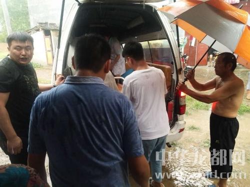 下午五點五十五分,鄲城縣第二人民醫院救護車到達現場。在經過醫護人員的檢查后,建議送到醫院進一步治療。此時,大雨如瓢潑一般,幫扶隊員羅明飛等人不顧大雨傾盆,抬擔架,打雨傘,將病人王洪花抬上了救護車,羅明飛等人全身的衣服和鞋襪全部濕透。