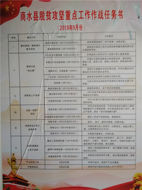 “‘脫貧攻堅重點工作作戰任務書’既是作戰圖、也是軍令狀,每個時間點開展哪些工作、達到什么效果、采取何種措施,都在‘作戰任務書’上顯現了出來。”9月5日上午,商水縣練集鎮朱集村脫貧責任組組長陳書敬指著張貼在村辦公室內的“商水縣脫貧攻堅重點工作作戰任務書”說。