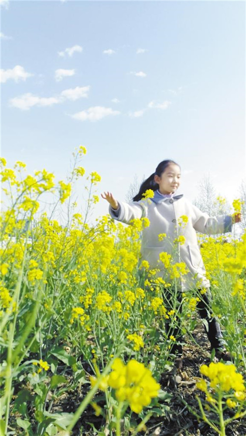 3月31日,記者在中心城區慶豐路與政通路交叉口附近看到,一位市民帶著孩子在盛開的油菜花里游玩、拍照,盡享春日美景。記者 關秋麗 攝