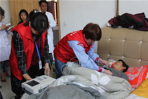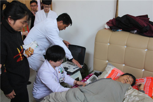 在王崗家中,專家們先后為王崗父母、妻子進行了彩超、心電圖、血壓、血糖等項目檢查,并根據檢測數據,現場分析、研究病情,做了詳細醫囑,還為他們送了包含各種項目的健康體檢表。
