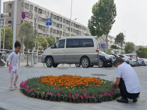 6月3日,一位市民帶著孩子在中心城區八一大道與交通大道交叉口附近的花草前拍照、玩耍。近日,城區大街小巷擺上了五顏六色的花卉,把城市裝扮得更加靚麗。