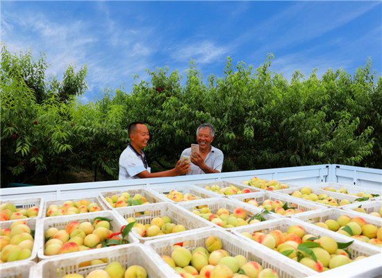 6月19日,在萬畝桃園里,桃農臉上洋溢著收獲的喜悅,看見記者拍照,熱情地從籃里桃了一個又大又紅的鮮桃遞給記者品嘗(圖一)。一名慕名而來的游客購買了十幾斤鮮桃后掏出手機掃描桃農的手機微信收款碼支付(圖二)。