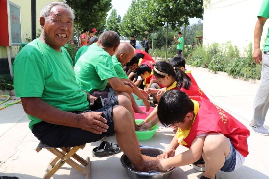 7月的太康,酷熱難耐。6日上午8時許,一輛公交車穩(wěn)穩(wěn)停靠在太康縣芝麻鄉(xiāng)敬老院門口,車上下來20多名身穿紅馬甲的學生志愿者,他們抬著米、面、油和雞蛋等物品走進敬老院。坐在門口等候的老人們,樂呵呵地上前迎接客人。整個敬老院一下子熱鬧起來。放下物品,孩子們立馬開始勞動,他們從老人們宿舍搬出馬扎、板凳,在院中擺放安穩(wěn),扶著老人坐上去,開始給老人洗腳。正上初中一年級的李博泉細心地幫72歲的張照志老人摳掉趾甲縫和腳底的污垢。張老漢流淚了:“這輩子有人給我洗腳,我真是不知道哪修來的福氣……”