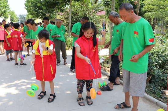 敬老院的老人們也不甘落后,孩子們表演結束后,老人們也向孩子們表演了拿手絕活——抖空竹。只見,小小的空竹在老人們手中忽高忽低、時快時慢,各種令人嘆為觀止的花樣動作,猶如行云流水、連綿不斷,引得孩子們齊聲叫好。學生們紛紛上前,從老人手里接過空竹,一邊討教一邊聯(lián)系,歡聲笑語不時在敬老院上空回蕩。