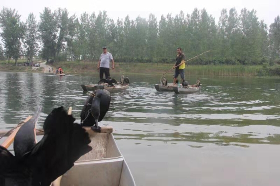 悄悄地,漁船輕移,飄至河心。船家一聲令下,鸕鶿箭一般竄入河中,或撲棱翅膀,搏擊水面,或緊追游魚,銜進口中。采風團成員,緊盯鸕鶿銜魚,快按鏡頭,收獲一張張豐收畫面。