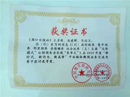 中國地市報新聞獎評選活動由中國地市報研究會主辦,每年舉辦一次,在全國有著廣泛的影響,此項新聞獎評選活動涉及全國幾乎所有地市黨報,不僅是展示地市黨報形象的重要舞臺,也是衡量地市黨報辦報水平的重要標志,同時也是以新聞的形式展示各地亮點工作的重要。《太康“五養模式”讓特困養老實現“菜單式”》稿件在此項新聞獎評選中,同樣表現不凡,最終榮獲中國地市報新聞獎二等獎。