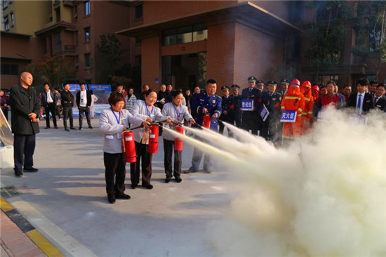 當日下午,高磊向參會人員演示并講解了滅火器的使用方法,并現場邀請社區干部和物業公司相關負責人員實際體驗滅火器的使用。隨后,在建業森林半島小區開展了消防演練活動。