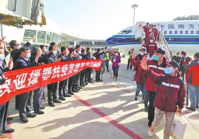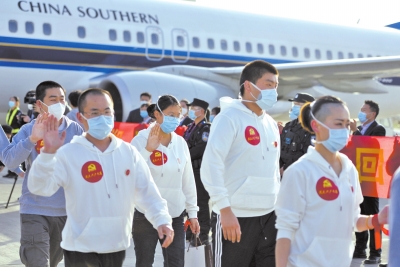 經一個多月的艱苦奮戰,453名健康勇士圓滿出色地完成了援助工作任務,平平安安、載譽歸來!省衛生健康委闞全程主任等領導到機場迎接,并轉達省委書記王國生、省長尹弘的親切慰問。