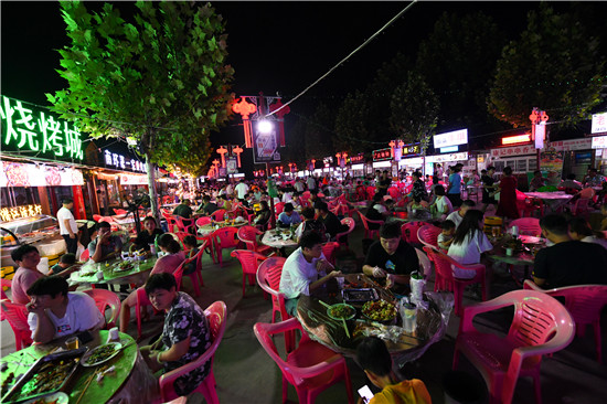 “天一熱就不想做飯,和朋友們吃點(diǎn)燒烤,喝點(diǎn)啤酒,清涼又解暑。”正在就餐的市民王先生說(shuō)。夜市旁邊還有露天舞場(chǎng),舞曲悅耳動(dòng)聽(tīng)。這里不僅是廣大市民消費(fèi)和娛樂(lè)的好地方,也是鍛煉身體的好去處。開發(fā)區(qū)附近的一位居民劉先生高興地說(shuō):“我們每天出來(lái)逛夜市,不僅讓自己放松了心情,而且還享受了一份清涼。”②3