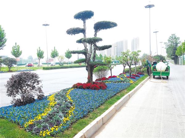 紅色、黃色、紫色的花兒,還有造型別致的景觀樹……10月21日,記者在周口中心城區七一東路的一處綠化帶內看到一組造型別致的景觀造型,扮靚了綠化帶,給人耳目一新的感覺。記者 張洪濤 攝