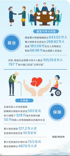 通過織牢就業經緯線,筑牢民生之本。截至今年8月底,我省累計新增城鎮就業643.02萬人,累計轉移農業勞動力268.92萬人,促進183.09萬失業人員再就業,幫助68.98萬就業困難人員就業;截至今年6月底,農民工返鄉創業人數累計達159.71萬人,帶動就業人數突破947.68萬人。5年來,我省牢牢守住了高校畢業生的就業“經線”、農民工的就業“緯線”,實現了就業穩定,社會穩定。