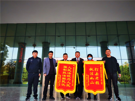 “人民法院為人民,強制執行解民憂”“打擊老賴,執法如山”。11月20日,鄲城縣王某剛把兩面鮮艷的錦旗送到鄲城縣法院執行民警手中,眼含熱淚,感激不已。