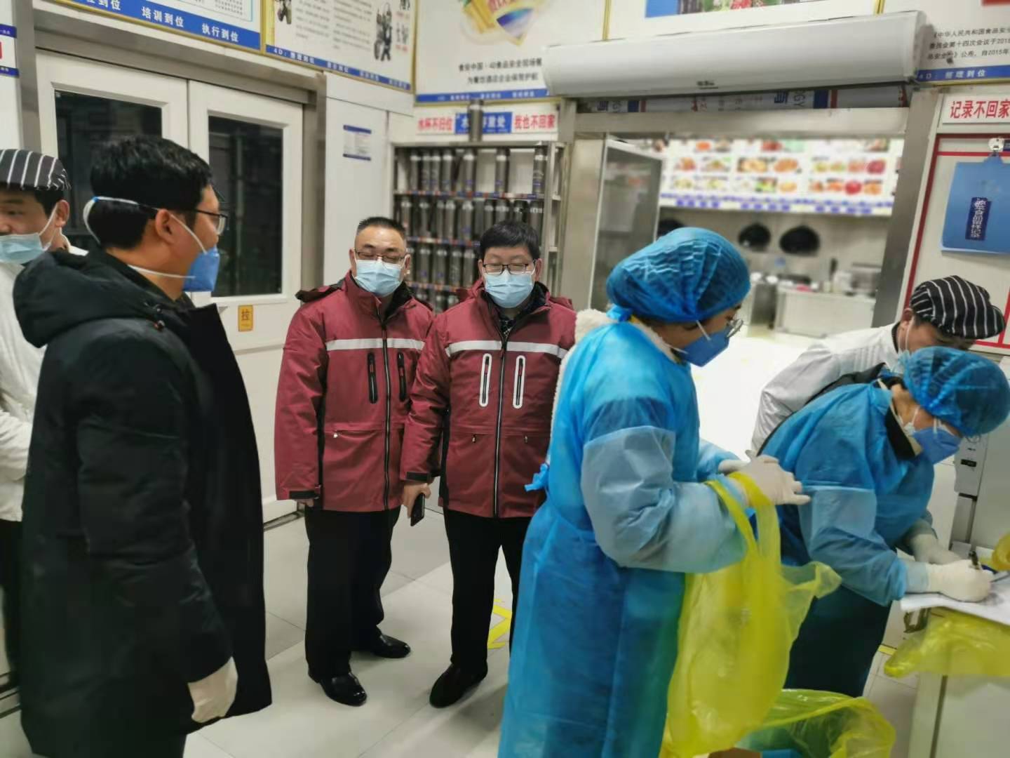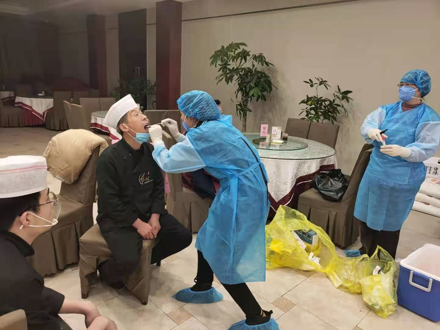 為助力第一屆周商大會圓滿成功,市衛生健康委抽調近百名調精兵強將組成衛生保障專班開展衛勤保障工作。圖為工作人員在市委黨校迎賓館和體育賓館餐廳對后廚人員做核酸檢測及開展冷鏈食品消毒。