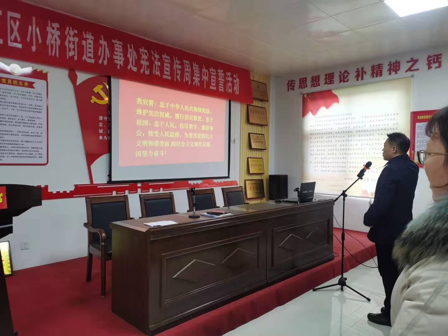 國(guó)歌響起,全體人員起立唱國(guó)歌。隨后,小橋街道辦事處黨工委書記侯明亮左手撫按憲法,右手舉拳,領(lǐng)誦誓詞,其他宣誓人跟誦誓詞。宣誓后,侯明亮對(duì)開展好憲法宣傳周宣傳活動(dòng)、學(xué)習(xí)黨的十九屆五中全會(huì)精神和習(xí)近平總書記關(guān)于憲法的重要論述做了具體安排部署,要求大家要結(jié)合當(dāng)前工作實(shí)際,做到依憲施政、依法行政,進(jìn)一步提高尊法學(xué)法守法用法意識(shí)。