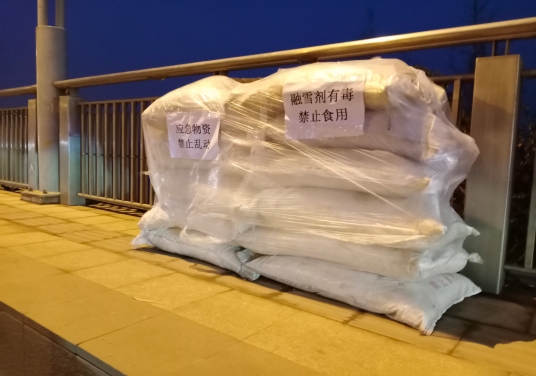 12日28日晚,記者在周口大道橋上看到,橋的兩側(cè)放置了五六堆融雪劑,以應(yīng)對即將到來的雨雪天氣,防止橋面結(jié)冰給車輛和行人造成不便,此舉受到路過行人一致好評。
