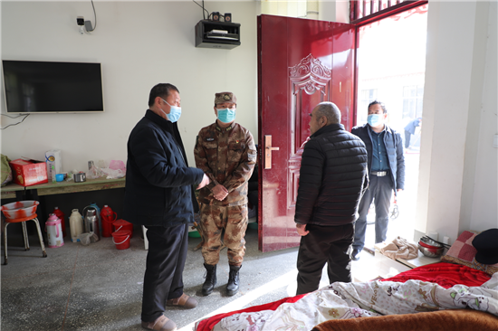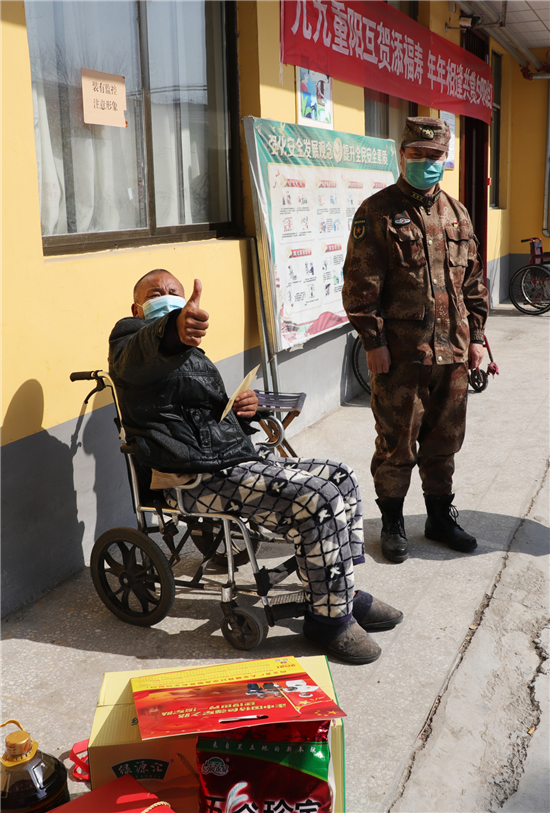 新橋鎮(zhèn)新兵楊凱入伍前和癱瘓的父親相依為命,市人武部領(lǐng)導(dǎo)協(xié)調(diào)地方政府,把其父親送到了新橋鎮(zhèn)敬老院公費(fèi)養(yǎng)老,解除他的后顧之憂。春節(jié)到了,人武部領(lǐng)導(dǎo)還牽掛著這個特困家庭,矯百成帶隊(duì)來到新橋鎮(zhèn)敬老院。此時正值中午,楊凱的父親正坐在屋外的輪椅上曬太陽,見到矯部長的突然到來,激動的眼含熱淚,他緊緊握住矯百成的手久久不愿松開。矯百成噓寒問暖,給他送上1000元慰問金和生活必需品,楊凱的父親用他那不太清晰的語言表達(dá)對部長的真誠感謝。在敬老院院長的帶領(lǐng)下,矯百成又來到老人的住室察看起居情況,詢問他平時生活狀況,當(dāng)?shù)弥先松畹暮苁娣r,矯百成滿意的笑了。