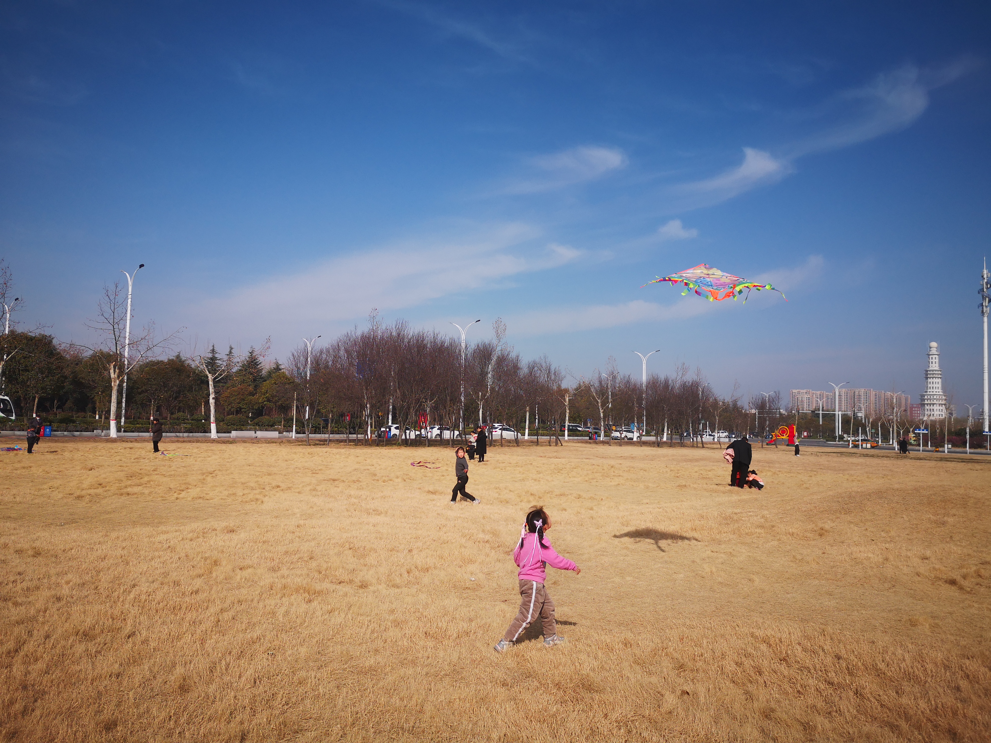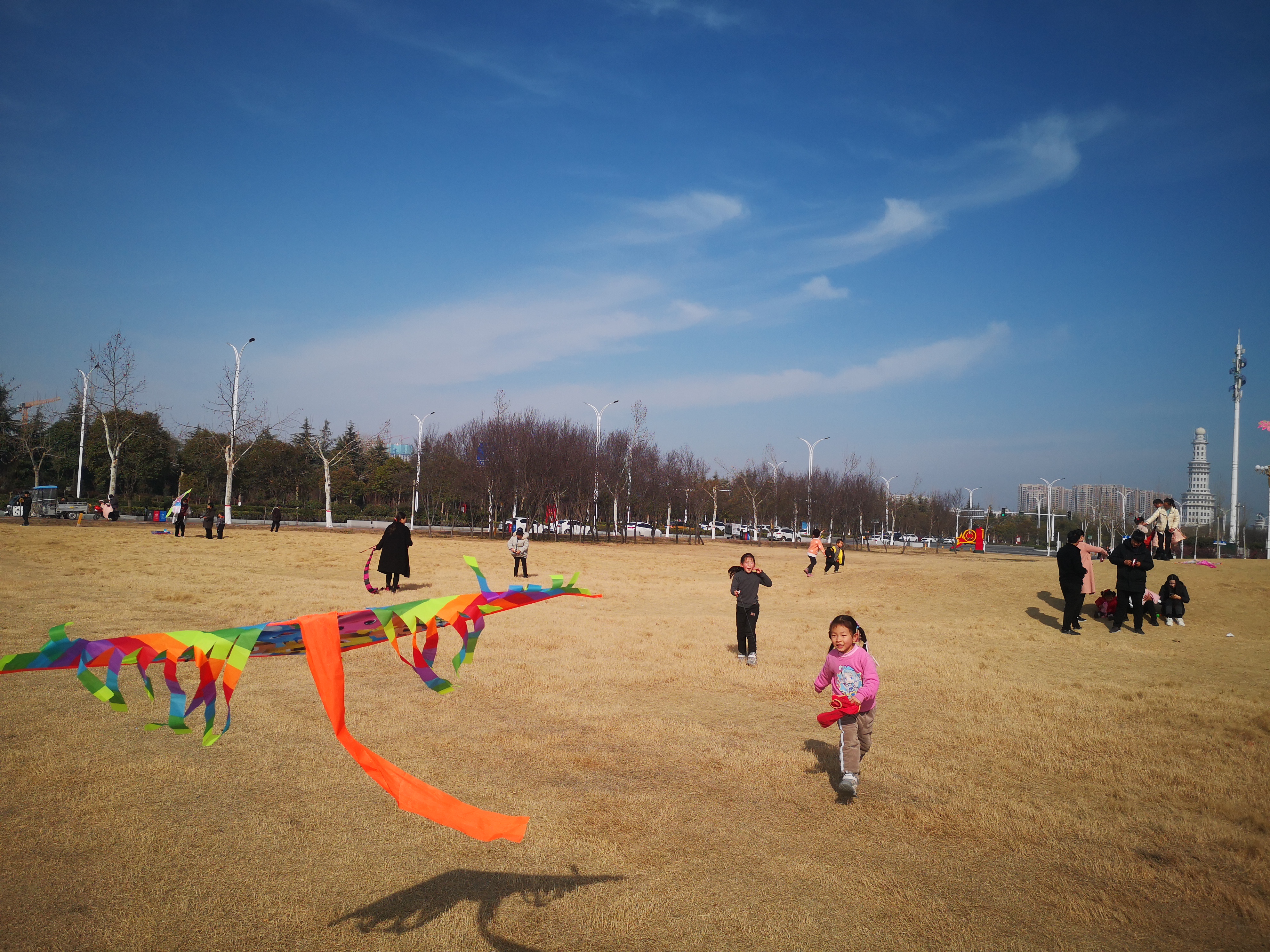 2月16日,周口大道旁邊的大草坪上,小朋友在放飛風箏。當日,藍天白云,春光正好,民眾樂享春節假日。