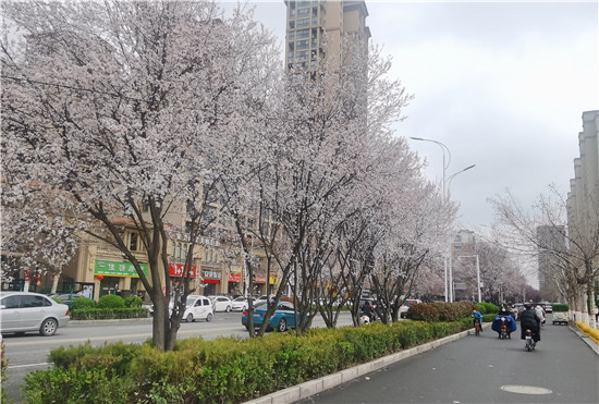 3月1日,慶豐街道兩邊的紫葉李花開似雪,紫葉李貫穿整個慶豐街,形成了一道靚麗的風景。盛開的紫葉李花瓣兒呈白色或粉色,微風拂過,花瓣兒飄散在空中,為過往的車輛下起了晴天里的花瓣雨。