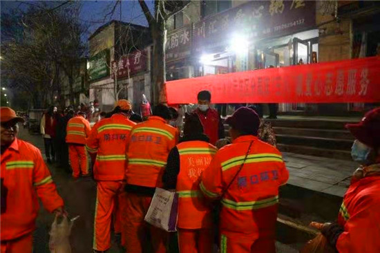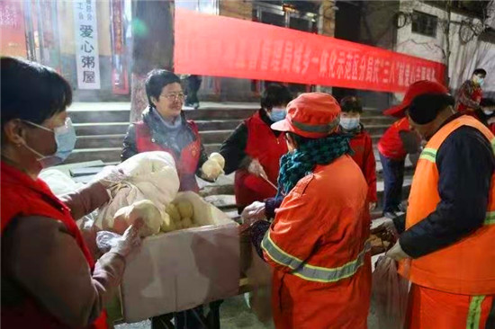當(dāng)日早上5時(shí),在愛(ài)心粥屋里,示范區(qū)分局的志愿者們穿著紅馬甲,戴上口罩,立即進(jìn)入忙碌狀態(tài),大家既分工明確又相互配合,現(xiàn)場(chǎng)井然有序。他們?yōu)榄h(huán)衛(wèi)工人盛飯端菜,拿雞蛋饅頭,動(dòng)作迅速,熱情周到,有條不紊,個(gè)個(gè)忙得不亦樂(lè)乎。在這個(gè)清冷的早晨,因?yàn)橛辛藷釟怛v騰的飯菜和志愿者忙碌的身影,環(huán)衛(wèi)工人開(kāi)心地笑容,感受到濃濃暖意。