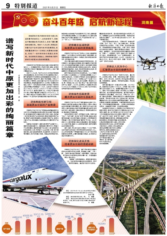黨的十八大以來,習近平總書記4次親臨河南視察并發表重要講話,多次對河南工作作出重要指示批示,賦予譜寫新時代中原更加出彩絢麗篇章的歷史使命,為河南發展指明了前進方向、提供了根本遵循。河南上下牢記囑托、不辱使命,堅定沿著習近平總書記指引的方向奮勇前進,把高質量發展作為1億河南人民最根本的福祉,實現了一系列具有標志性意義的突破,中原更加出彩宏偉事業向前跨越了一大步。全省生產總值先后邁上3萬億元、4萬億元、5萬億元3個大臺階,2020年達到5.49萬億元、穩居全國第5位,人均生產總值突破8000美元,糧食產量連續4年穩定在1300億斤以上。今年一季度,地區生產總值同比增長15.4%,比2019年同期增長7.7%,經濟運行呈現穩定恢復、穩定向好態勢。