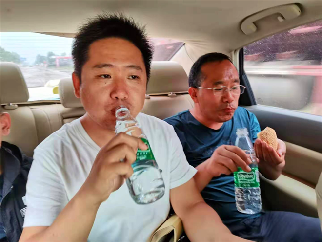 記者連續在扶溝賈魯河防汛一線采訪一整天時間,圖為周口日報記者張勁松、張洪濤在采訪車中吃飯。